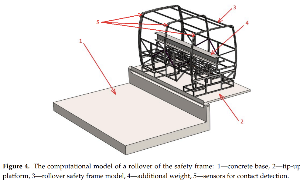 Here, 1โ€”the concrete surface (base); 2โ€”the tip-up platform; 3โ€”the tip-up spatial model of the safety structure with an auxiliary stand; the width of the stand conforms to the width of the rear axle of the coach and the lower part conforms to the point of a wheelโ€™s support on the base; 4โ€”an additional mass of 610 kg; and 5โ€”sensors for contact detection.