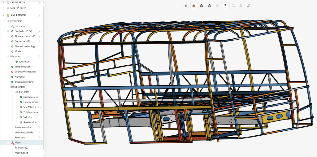 • The center of gravity of the frame structure is calculated to ensure that the additional mass (610 kg) is loaded in a way that simulates real operating conditions, such as seats and passengers in the bus.