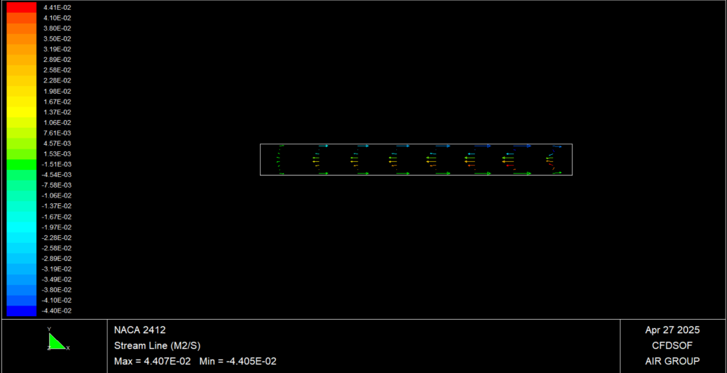 Gambar di atas merupakan hasil simulasi sederhana pada airfoil berbentuk persegi panjang dimana terdapat aliran udara sebesar 0.1 m/s di sisi atas dan bawah yang menghasilkan vektor kecepatan seperti di atas.