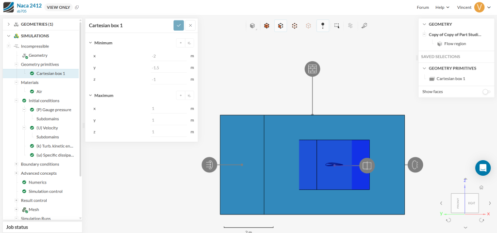 Sedangkan simulasi di bawah ini menggunakan SimScale untuk mensimulasikan Naca 2412. Geometri environment (lingkungan) yang digunakan sebesar 3.0 m x 2.5 m x 2.0 m.