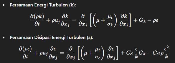 Model ini digunakan dalam simulasi CFD untuk menangkap karakteristik turbulen pada kecepatan tinggi yang sangat berpengaruh terhadap distribusi tekanan dan gaya pada wing.