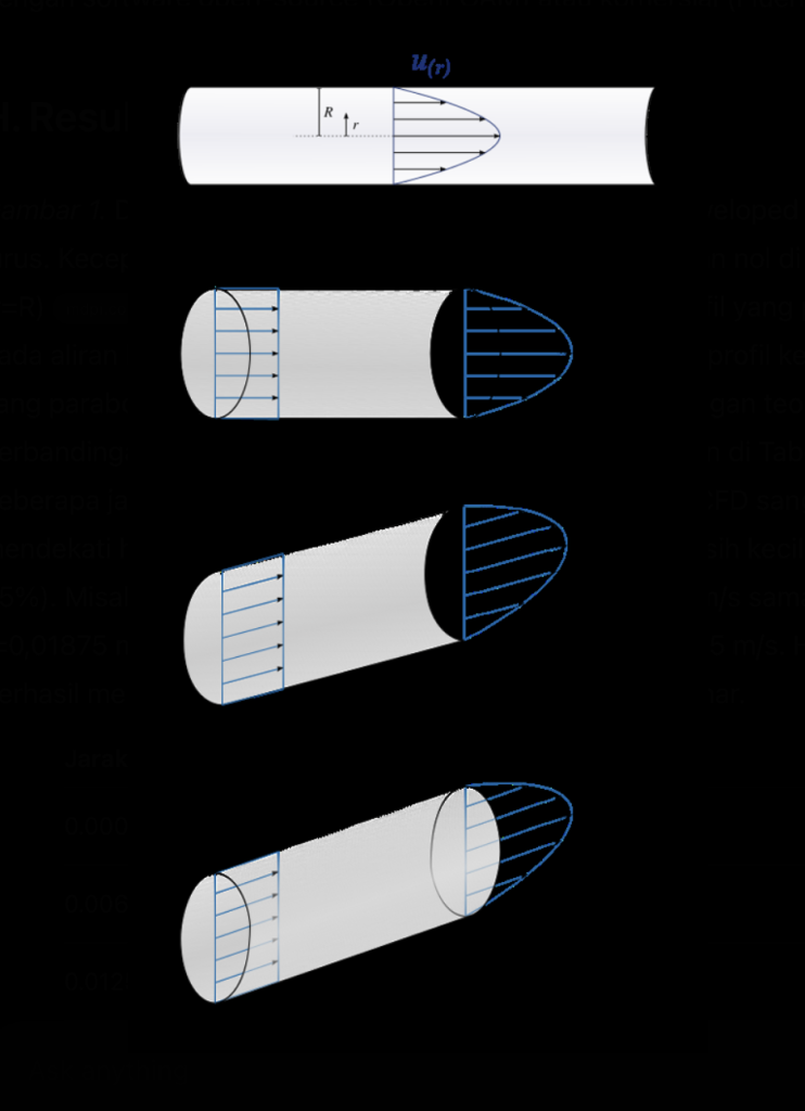 - Deep Awareness (of) I: Analisis aliran laminar dalam pipa lurus ini dilakukan untuk memahami distribusi kecepatan dan perbedaan tekanan pada aliran laminar yang bersifat Newtonian dalam kondisi steady-state dan isothermal. Pemahaman ini penting bagi rekayasa fluida karena aliran laminar merupakan aliran dasar sebelum transisi ke turbulensi. Simulasi numerik digunakan untuk menggali perilaku aliran dan memverifikasi profil kecepatan teoretis yang bersifat parabolik.