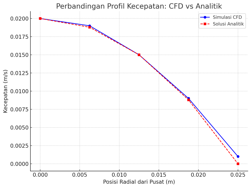 - Garis biru menunjukkan hasil dari simulasi CFD, sedangkan garis merah putus-putus menunjukkan hasil dari solusi analitik.