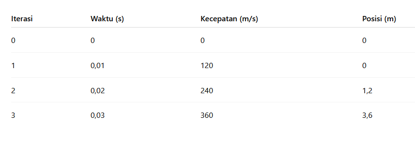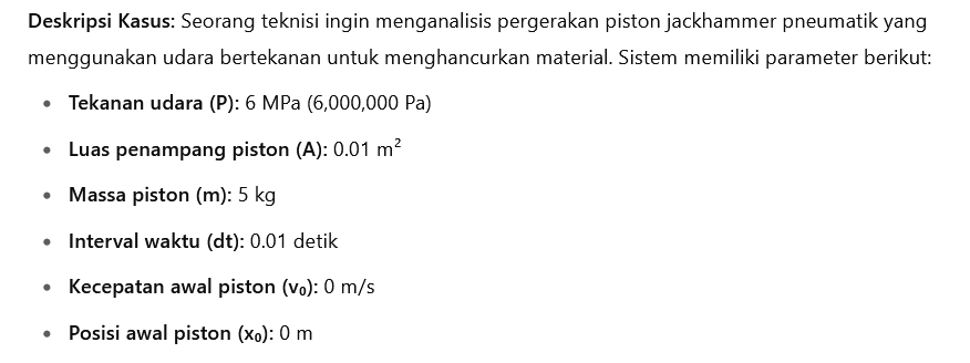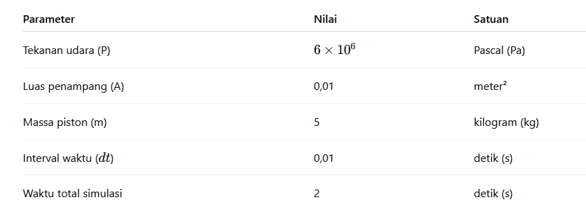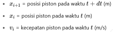 - Gunakan metode integrasi Euler untuk menghitung kecepatan dan posisi piston pada setiap interval waktu: