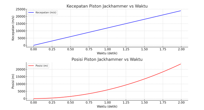 Hasil simulasi menunjukkan bahwa kecepatan piston meningkat secara signifikan pada setiap iterasi, sementara posisi piston juga bertambah dengan cepat karena percepatan yang sangat besar.