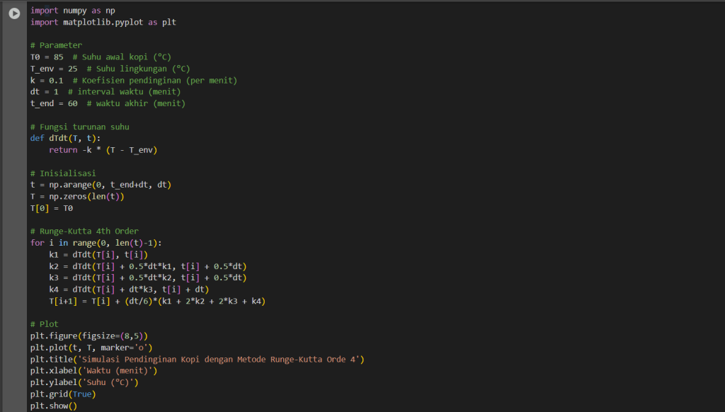 Proyek ini bertujuan untuk mensimulasikan proses pendinginan kopi menggunakan metode numerik RK4, yang menawarkan ketelitian lebih tinggi dibanding metode Euler sederhana.