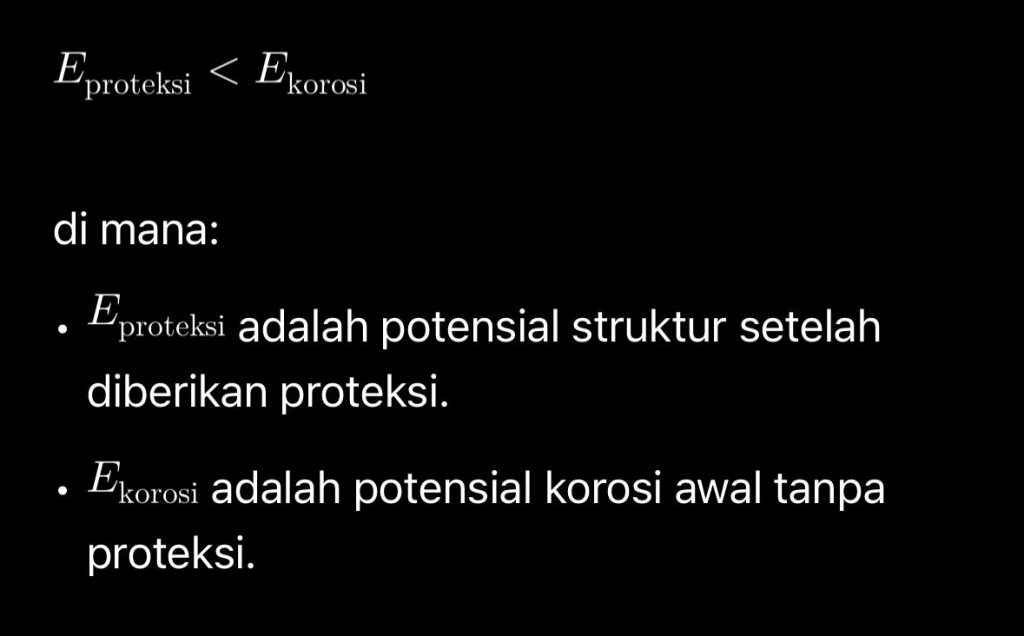 Pada prinsip proteksi katodik, kondisi proteksi tercapai saat potensial logam lebih negatif dari potensial korosi. Secara sederhana dinyatakan :