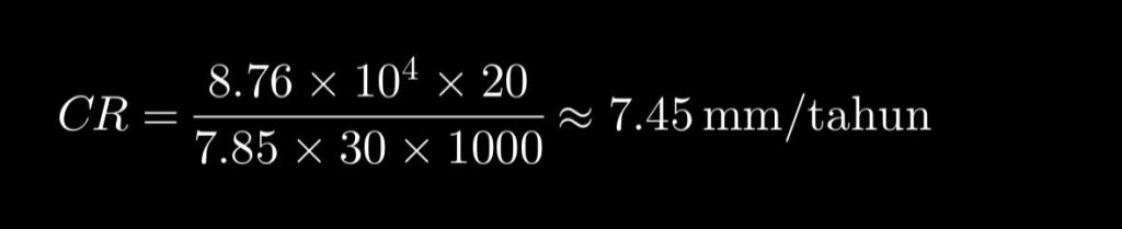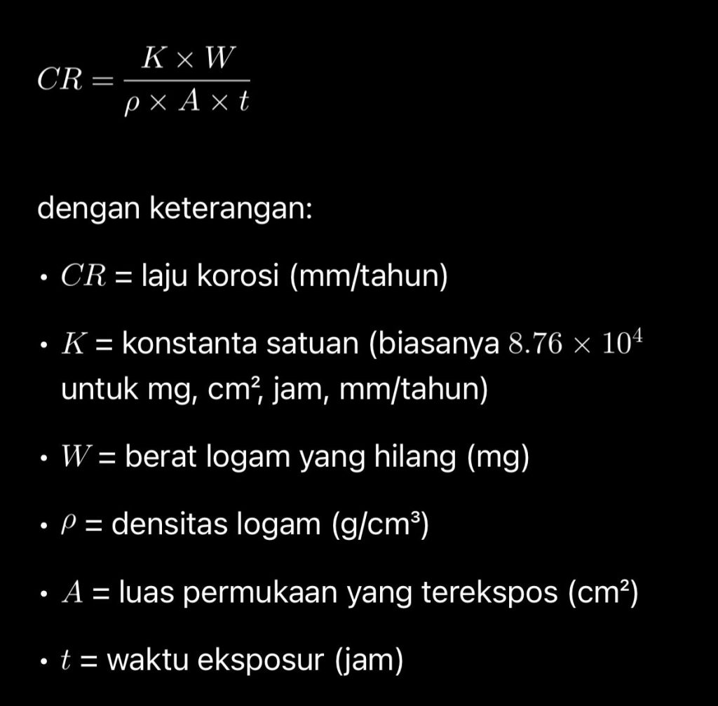 Untuk mendukung analisis kuantitatif, digunakan beberapa rumus teknis dalam pengukuran laju korosi dan efektivitas proteksi.