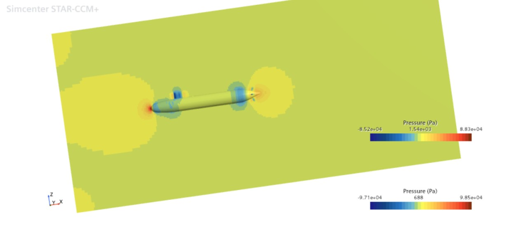 - Tekanan hidrodinamik (data dari Simcenter STAR-CCM+): Variasi tekanan 8.52e+04 Pa hingga 9.85e+04 Pa.