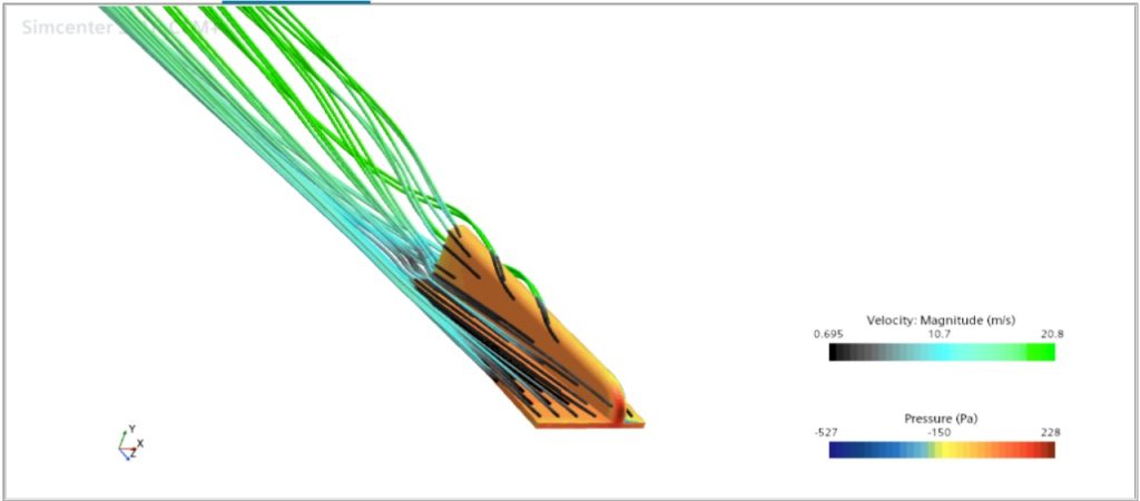 Pola streamline menunjukkan pembentukan vorteks di sekitar vortex generator. Aliran yang awalnya sejajar terganggu dan membentuk putaran, menandakan peningkatan turbulensi terkontrol. Efek ini membantu memperkuat energi aliran di dekat permukaan dan menjaga aliran tetap melekat lebih lama.