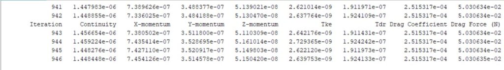 • Tabel iterasi (941-946) mencakup parameter seperti continuity (1.4479e-06 hingga 1.4592e-06), momentum di arah X (7.3896e-07 hingga 7.4541e-07), Y (3.4837e-07 hingga 3.5145e-07), dan Z (5.1390e-08 hingga 5.1504e-08), serta koefisien drag (1.9119e-07 hingga 1.9241e-07) dan gaya drag (2.5153e-04 N). Nilai continuity yang sangat kecil menunjukkan konvergensi numerik yang baik, di mana keselarasan massa terjaga di seluruh domain. Momentum stabil di setiap arah menunjukkan aliran yang konsisten, sementara koefisien dan gaya drag yang konstan mengindikasikan bahwa simulasi telah mencapai kondisi steady-state. Ini penting untuk memastikan keandalan hasil drag force yang dihitung.