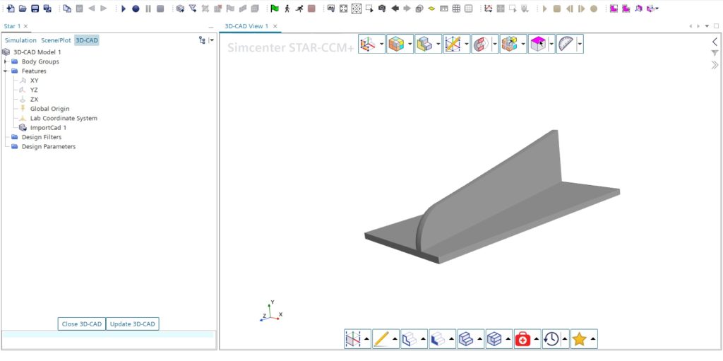 Gambar tersebut menunjukkan display awal Simcenter STAR-CCM+ untuk mempersiapkan model 3D-nya, yaitu vortex generator.