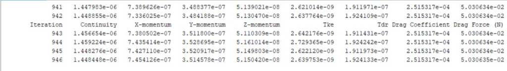 - Data Konvergensi Simulasi (Lampiran Gambar 2):Data numerik ini menyajikan hasil iterasi simulasi, termasuk parameter-parameter penting seperti Continuity, Momentum (X, Y, Z), Tke, Tdr, Drag Coefficient, dan yang krusial, Drag Force (N). Data ini menunjukkan bagaimana nilai-nilai parameter tersebut secara bertahap mencapai konvergensi atau stabilisasi seiring bertambahnya iterasi. Sebagai contoh, pada iterasi 946, Drag Force terlihat telah stabil di angka sekitar 5.030635ร10โ2 N. Stabilitas ini menandakan bahwa simulasi telah mencapai solusi yang dapat diandalkan.