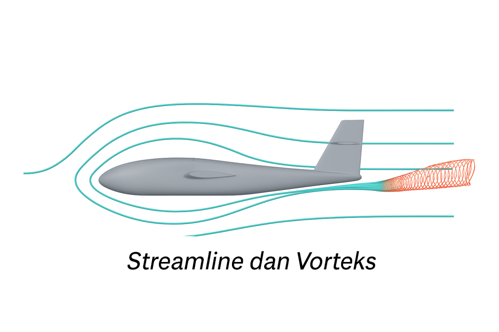 - Vorteks terlihat sebagai pusaran kecil atau kelokan tajam pada garis-garis streamline.