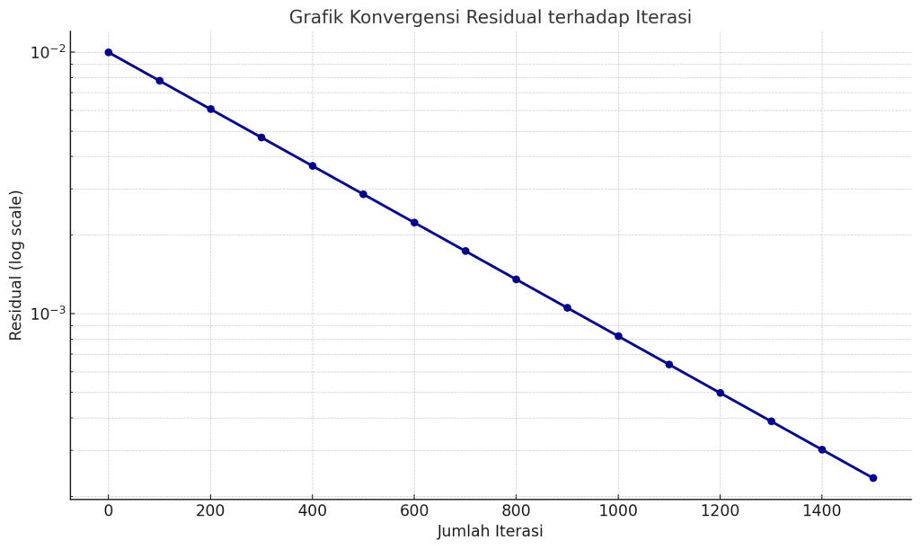- Grafik Konvergensi Residual menunjukkan bahwa semakin banyak iterasi, nilai residual menurun menuju nol, menandakan bahwa solusi mendekati konvergen.