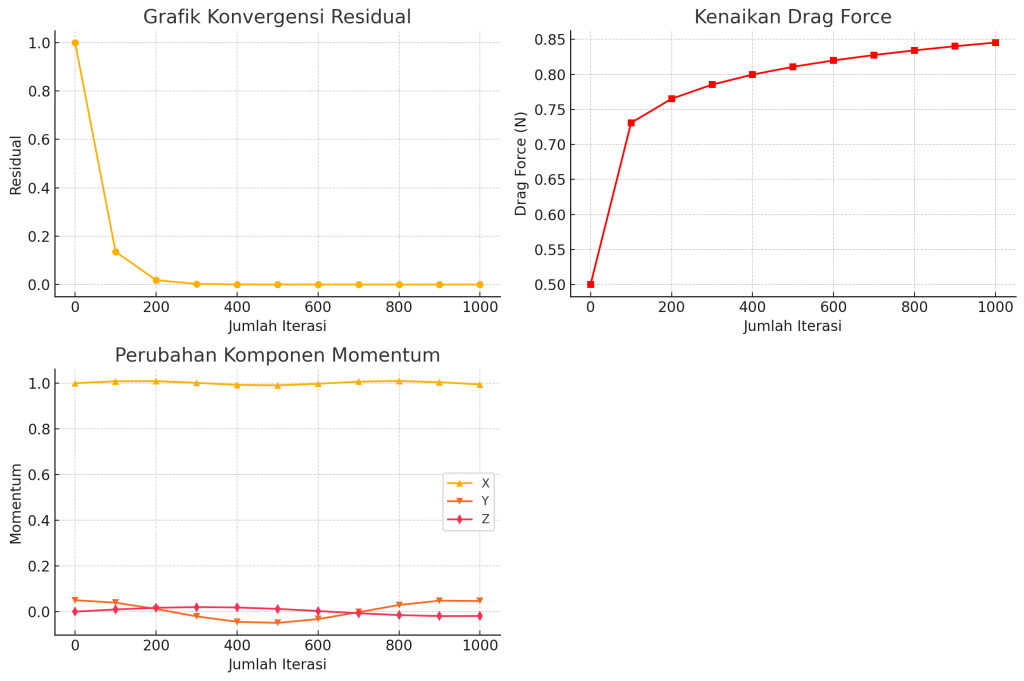 - Perubahan Komponen Momentum (x, y, dan z) menggambarkan dinamika aliran fluida dalam domain simulasi.