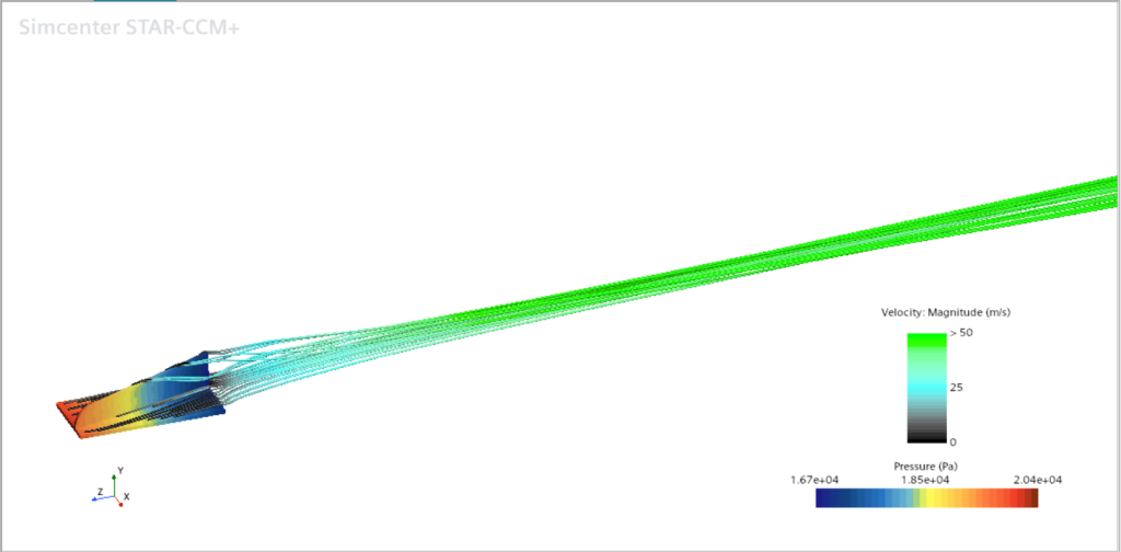 Aliran mengalir dengan lancar mengikuti bentuk permukaan objek. Tidak ditemukan area stagnasi besar atau eddy besar, yang menunjukkan performa aerodinamis objek cukup baik.
