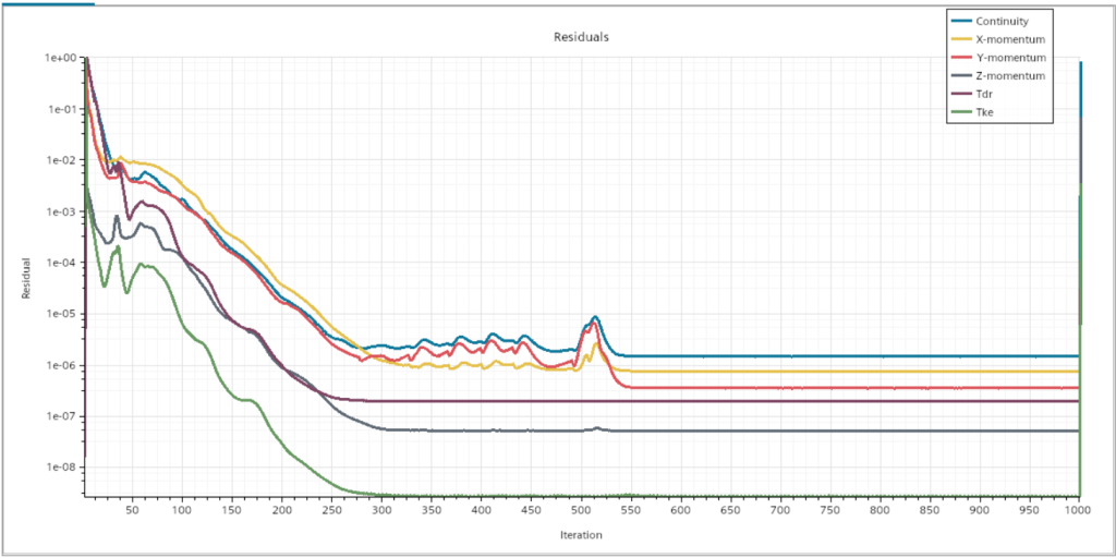 Terjadi gradien tekanan yang menandakan akselerasi dan deselerasi aliran akibat bentuk geometri. Tekanan tertinggi ditemukan di area stagnasi, sedangkan tekanan menurun tajam di bagian trailing. - Grafik Residual: