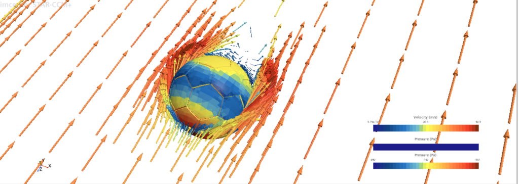Hasil simulasi divisualisasikan dalam bentuk vektor kecepatan dan kontur tekanan. Terlihat jelas zona stagnasi di bagian depan bola (tekanan tinggi), separasi aliran di sisi samping, dan wake di bagian belakang dengan tekanan rendah. Distribusi tekanan ini menjelaskan gaya drag utama yang bekerja, serta potensi lift yang bisa timbul jika aliran asimetris. Panel bola mempercepat separasi aliran dan meningkatkan efek turbulensi, menjelaskan mengapa bola dapat melayang tidak stabilโfenomena yang juga diteliti dalam fisika sepak bola profesional.