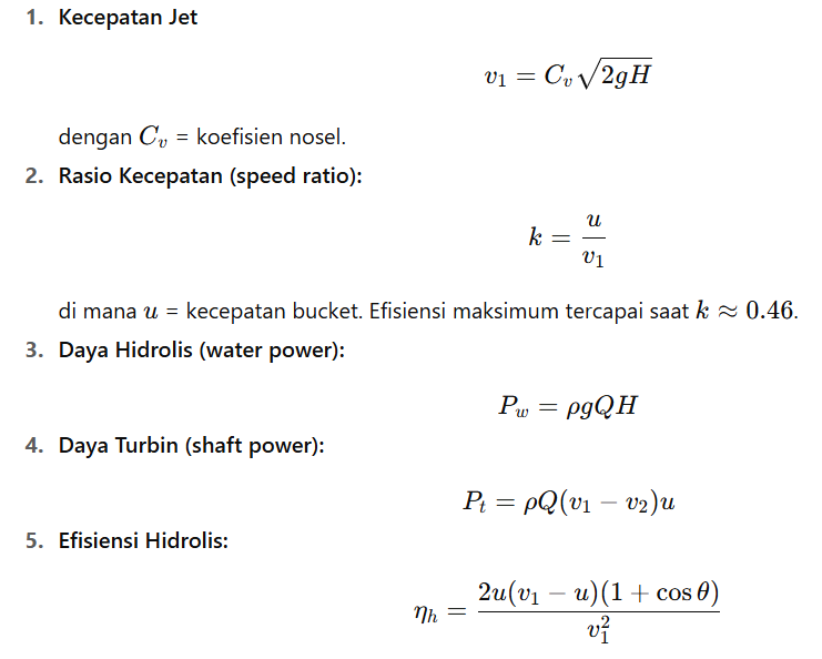 Turbin impuls Pelton Wheel bekerja dengan prinsip perubahan momentum jet air berkecepatan tinggi yang diarahkan ke sudu (bucket) sehingga menghasilkan gaya dan putaran rotor. Turbin ini paling efisien digunakan pada head tinggi dengan debit rendah, dan dapat mencapai efisiensi hingga 90% jika desain bucket, nosel, dan sudut defleksi optimal.