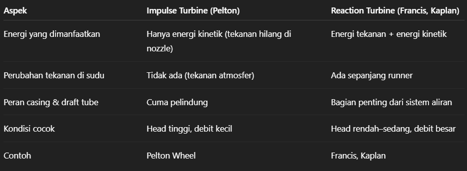 Kenapa dinamakan reaction turbine? Karena energi air yang dikonversi jadi energi mekanik di runner tidak hanya dari impuls (tumbukan), melainkan juga dari reaksi akibat perubahan tekanan fluida di sepanjang sudu runner. Jadi di dalam runner, baik energi tekanan maupun energi kecepatan ikut berubah. Sehingga casing + draft tube bukanlah sekadar pelindung, tetapi bagian aktif dari mekanisme turbin (berbeda dengan impulse).