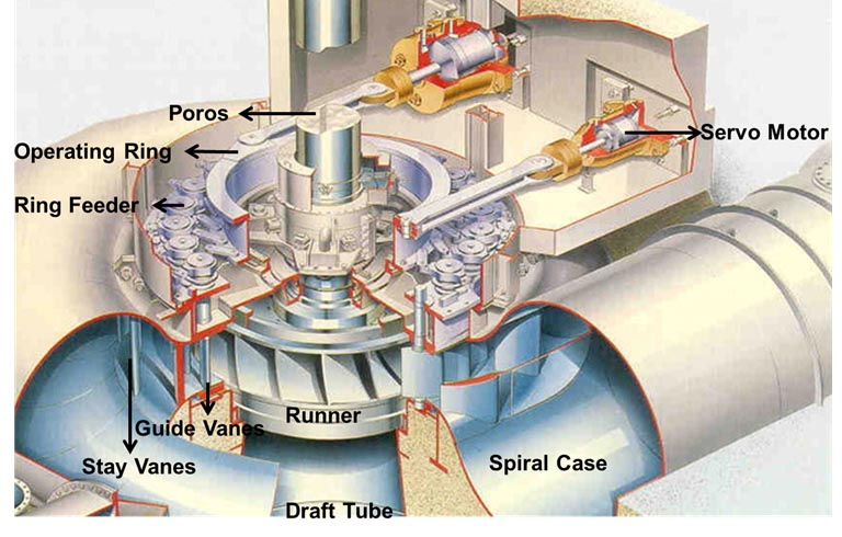 Pada ilustrasi di atas terlihat bagaimana air diarahkan dari spiral casing menuju guide vanes, lalu masuk ke runner sebelum diteruskan ke draft tube. Keberadaan guide vanes tidak hanya menentukan jumlah debit yang masuk, tetapi juga arah dan komponen tangensial aliran. Hal ini berhubungan erat dengan desain runner, karena keselarasan antara sudut keluaran guide vane dan bentuk runner akan menentukan kelancaran aliran serta efisiensi energi yang bisa diekstraksi. Perubahan kecil pada sudut vane dapat menimbulkan deviasi aliran yang berpengaruh pada distribusi tekanan sepanjang sudu, sehingga potensi kerugian energi bisa meningkat jika tidak diatur dengan tepat.