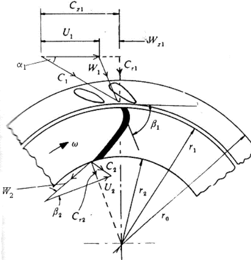 ฮฒ1: sudut antara kecepatan relatif masuk W1โ dengan arah tangensial sudu.