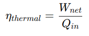 - Efisiensi termal (ηₜ): didefinisikan sebagai rasio kerja bersih terhadap panas masuk dengan rumus: