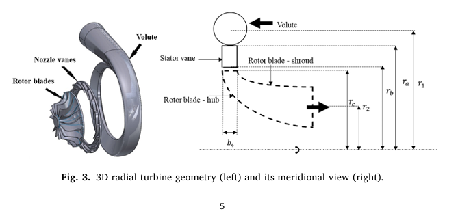 Pada sistem dua tahap ini, fluida kerja yang keluar dari tahap pertama dipanaskan kembali di evaporator sebelum masuk ke tahap kedua. Proses reheating ini bertujuan untuk meningkatkan kualitas uap (dryness fraction) agar tetap berada pada kondisi kering, sehingga risiko pembentukan uap cair dapat ditekan. Secara geometrik, desain turbin radial (seperti ditunjukkan pada Fig. 3) menggunakan parameter seperti radius rotor (rโ, rโ), tinggi bilah (bโ), dan kecepatan keliling (tip speed, U = ฯr) untuk mengatur arah dan kecepatan aliran.