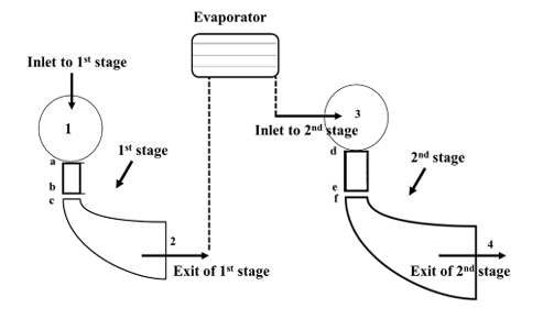 skema dua tahap turbin radial (two-stage radial turbine) pada sistem Reheat Organic Rankine Cycle (RORC). Pada tahap pertama (1st stage), fluida kerja (uap) masuk melalui saluran inlet (1) menuju turbin pertama, kemudian mengalir melewati bilah turbin dan keluar melalui exit (2) setelah mengalami ekspansi dan kehilangan sebagian energinya. Uap yang keluar ini masih mengandung kelembapan, sehingga diarahkan kembali ke evaporator untuk dipanaskan ulang (reheating) agar kualitas uap meningkat dan menjadi lebih kering.