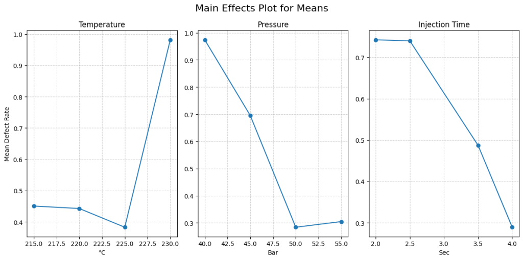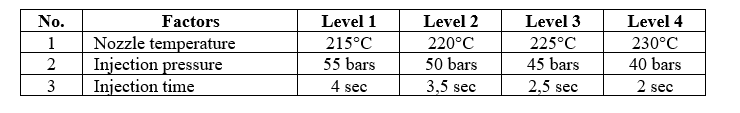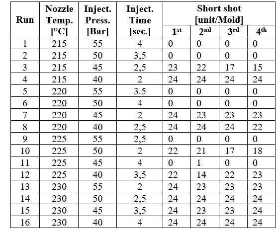 Three machine parameters were identified as the most influential in determining short-shot occurrence. Each parameter was assigned four levels based on the machine capability window, material behavior, and production constraints.