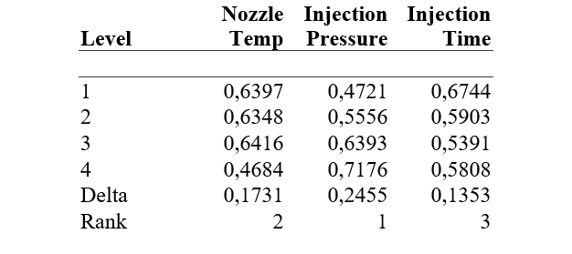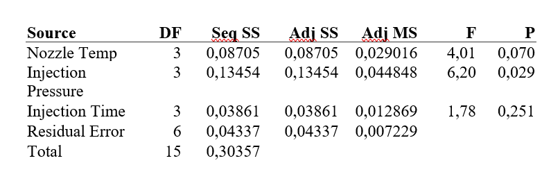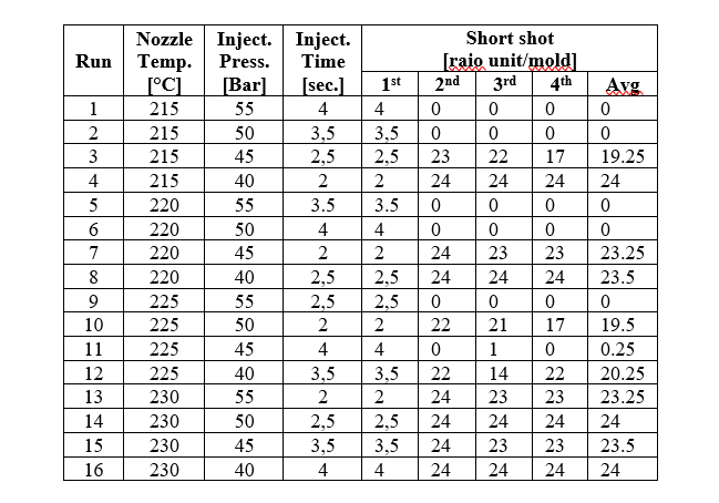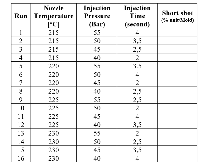 Three key process parametersโnozzle temperature, injection pressure, and injection timeโwere evaluated across four levels each. Experimental data were collected through controlled trials on a 24-cavity mold, and the average short-shot percentage was calculated for each run. ANOVA results demonstrate that injection pressure is the only statistically significant parameter with a strong impact on short-shot occurrence (P = 0.029). Nozzle temperature and injection time showed weak, non-significant influence within the tested operational range.