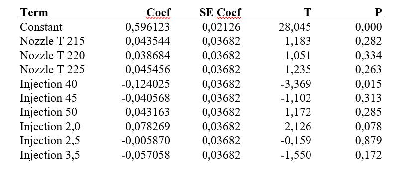 The regression model achieved an R-Squared value of 85.71%, indicating strong predictive capability. Taguchi response analysis identified the optimal parameter combination as: Nozzle Temperature = 225ยฐC, Injection Pressure = 55 bar, Injection Time = 2.0 seconds. These settings were validated using a Python simulation and confirmed to produce zero short-shot defects.
