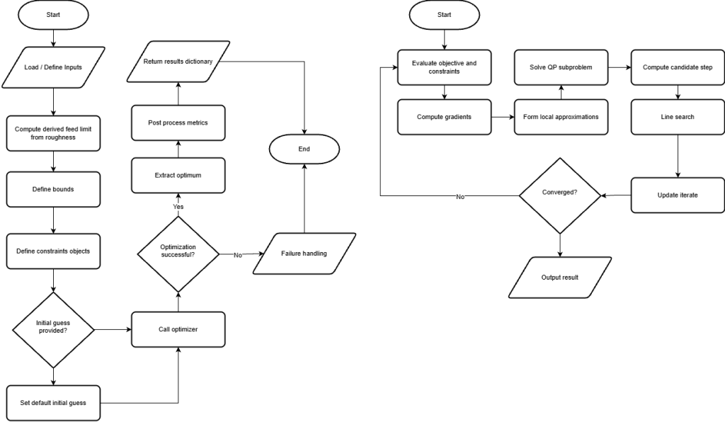 A hardened Python script (Module 10) was developed containing:- Data classes for geometry, machine, tool, and constraints