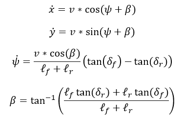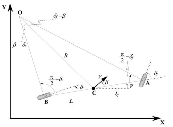 Gambar 2 menunjukkan ilustrasi kinematika kendaraan, dimana (V) adalah kecepatan kendaraan yang memiliki arah dengan sudut (beta) terhadap kendaraan. Dengan parameter (delta_f, delta_r) adalah sudut kemudi roda depan dan belakang, namun karena roda belakang umumnya tidak dapat dikendalikan, maka (delta_r) dapat dijadikan 0. (l_f, l_r) merupakan jarak antara roda terhadap center of gravity (CoG) kendaraan. (psi) adalah sudut kendaraan relatif terhadap garis horizontal (aksis x).