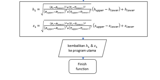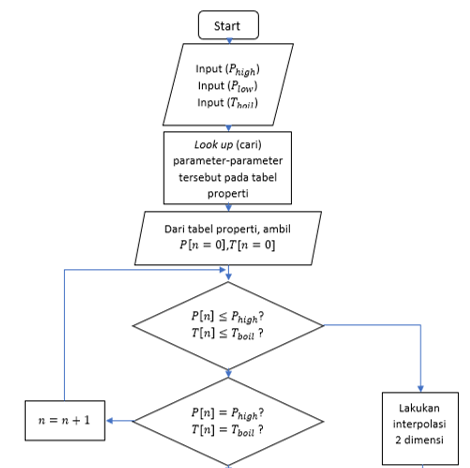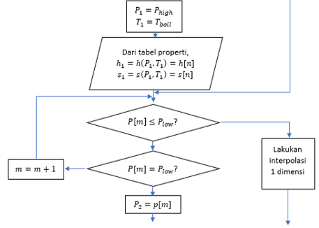 Perhitungan energi rankine cycle akan dilakukan menggunakan data dari tabel properti terutama data entalpi dan entropi. Data tabel properti akan dimasukkan pada program kemudian diambil datanya menggunakan look up, jika data tidak terdapat pada tabel properti, data akan dicari menggunakan interpolasi linear dari data disekitarnya.