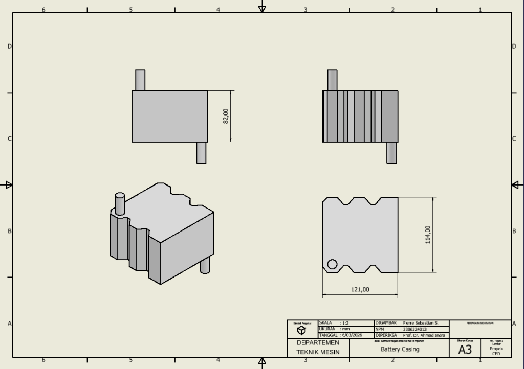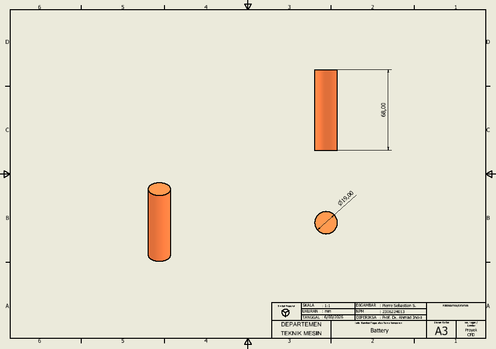 Tahapan pertama dalam analisis CFD adalah membuat geometri sistem yang akan disimulasikan. Pada tahap ini, saya menggunakan software Autodesk Inventor untuk membuat model tiga dimensi dari komponen utama sistem baterai.