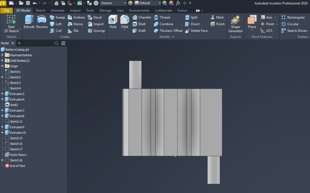 Langkah pertama yang saya lakukan adalah membuat battery casing atau wadah utama tempat baterai disusun. Komponen ini berfungsi sebagai struktur utama yang menampung sel baterai serta menjadi bagian dari sistem manajemen termal.