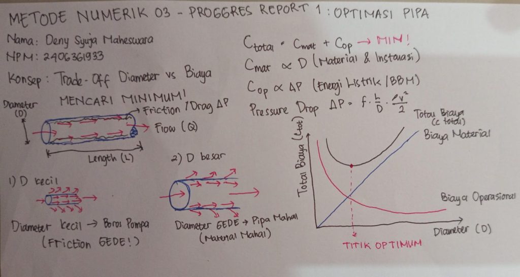 Selamat pagi/siang Prof. DAI dan teman-teman sekalian! Saya Deny Syuja Maheswara dari kelas Metode Numerik 03 ingin menyampaikan progress report pertama untuk proyek optimasi saya. Topik yang saya angkat adalah: “Optimasi Diameter Pipa untuk Mendapatkan Keseimbangan (Trade-Off) Antara Penggunaan Energi Pompa dan Biaya Material Pipa”.